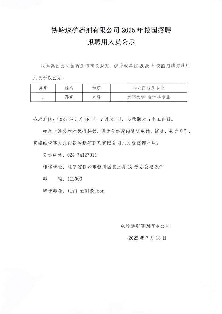 鐵嶺選礦藥劑有限公司2025年校園招聘擬聘用人員公示